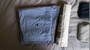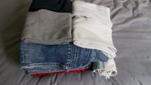 Vous ne pourrais pas utiliser cette technique pour tous vos vêtements puisque vous aurez besoin de plus de t-shirt que de pantalon. En effet un t-shirt va être utiliser une journée voir deux grand maximum, mais un pantalon (surtout jean) va pouvoir tenir facilement 3 ou 4 jours.