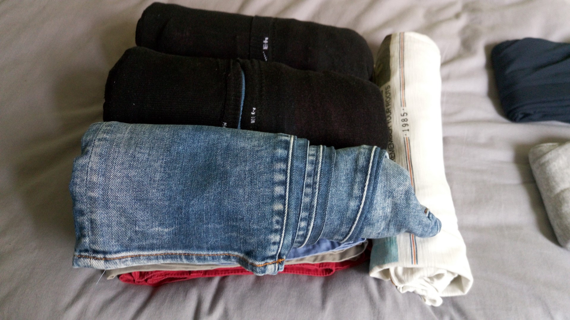 Commençons par une technique bien connue des scouts ! Il s’agit d’enrouler un t-shirt, un jean, un sous-vêtement et une paire de chaussette. J’appelle personnellement cette méthode la capsule. Comme dans Dragon-Ball, cette capsule de vêtement nous promet un change complet dans un minimum d’espace.