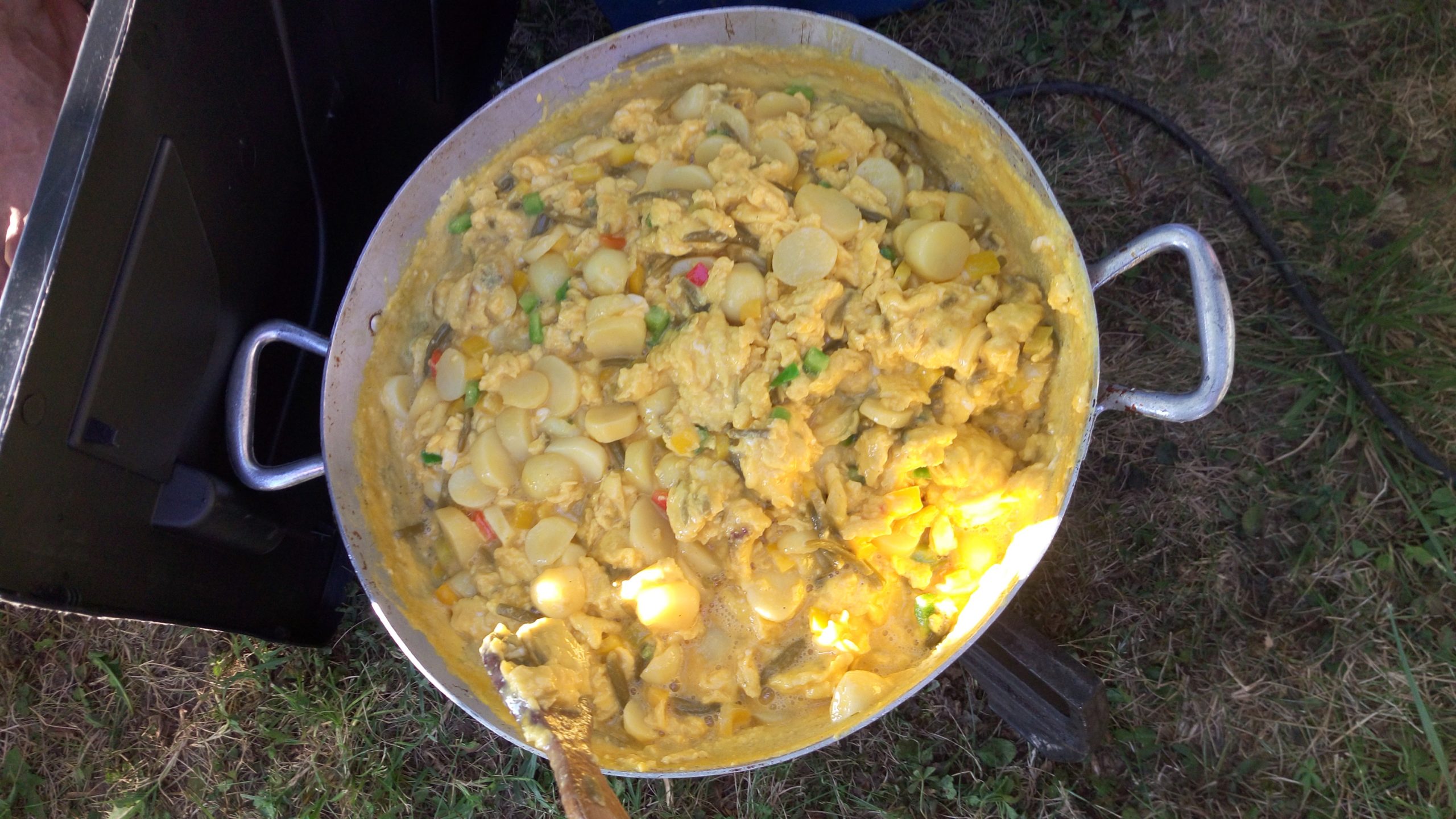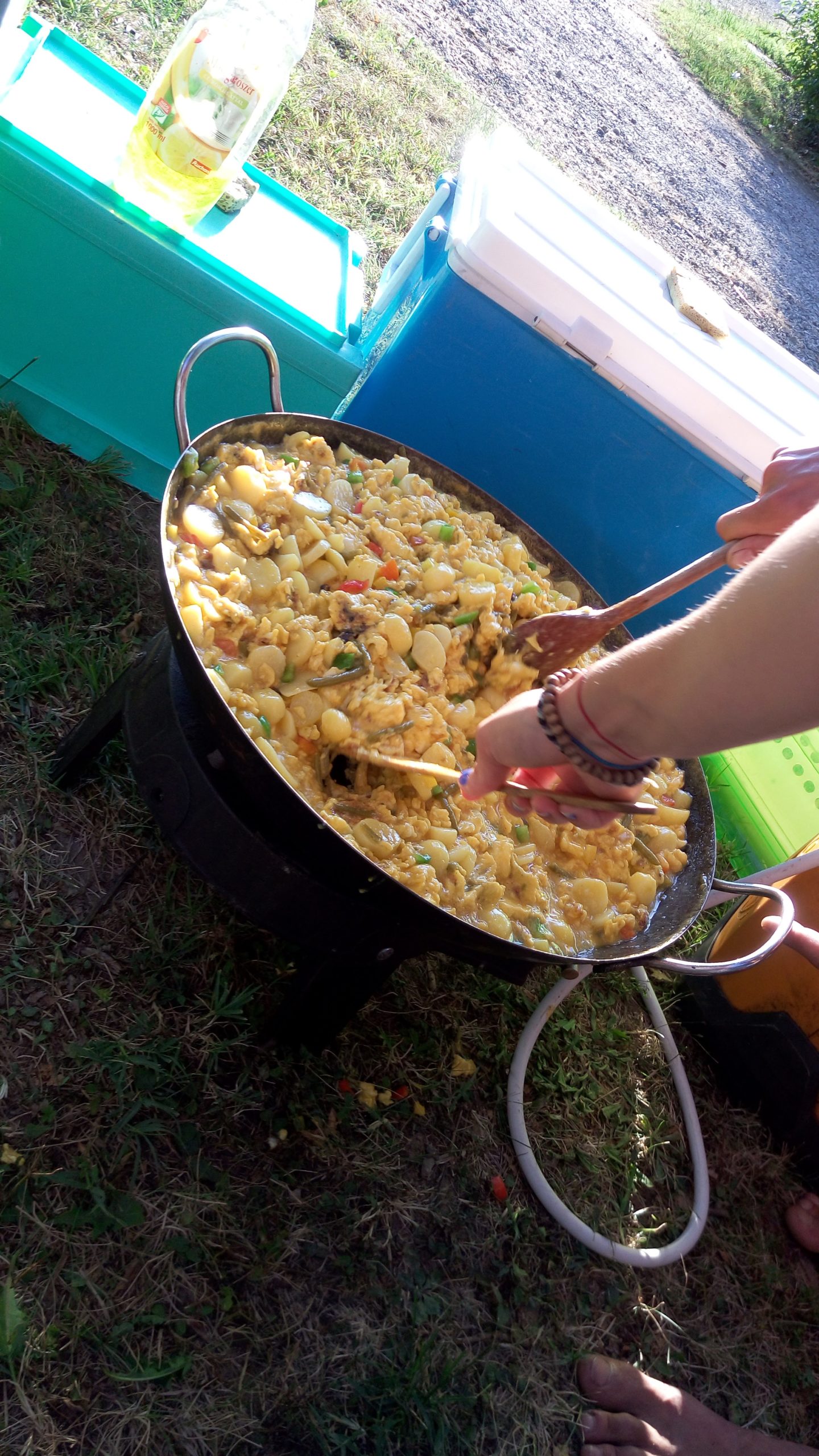 Nous arrivons donc vers 18 h, (à environ 1h de Lyon) après nombreuses heures de bus. Même en France nous n’échappons pas à la règle du camping ! Nous montons donc rapidement nos tentes et direction les marmites pour ma part. Après avoir cassé une centaine d’œuf, je me suis occupé de la cuisson de deux énormes omelettes.