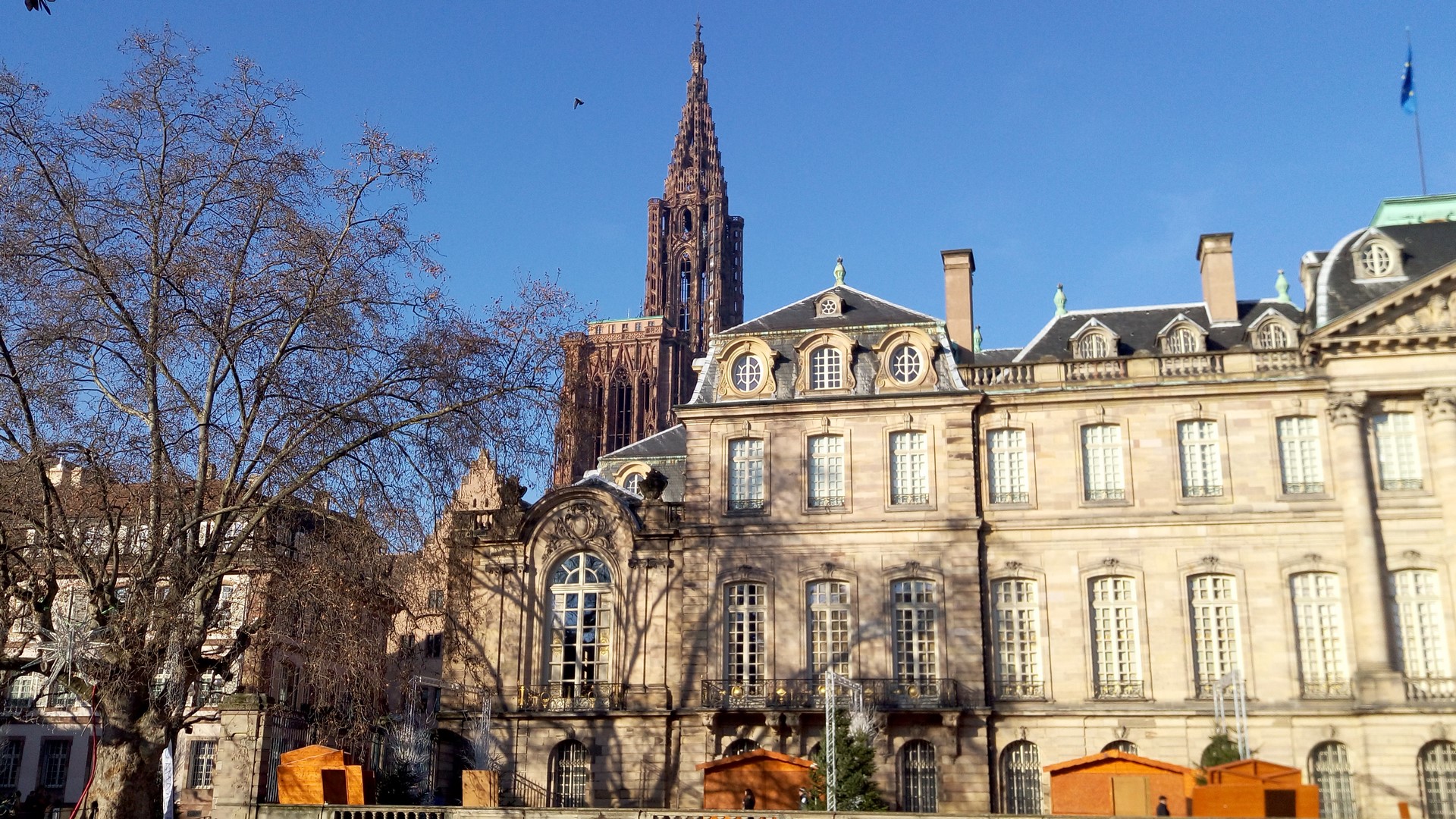 11h : Tout commence ! Rendez-vous place Kléber. Dès notre arrivée, nous ne pouvons que remarquer le majestueux sapin qui trône sur la place. Il s’agit de l’un des plus grands décorés d’Europe avec ses 27 mètres de haut. Autre élément primordial qu’on ne peut pas éviter : le froid ! Il fait FROID ! OUI, c’est normal et nous le savions, mais NON, prévoir et le vivre ce n’est pas la même chose !